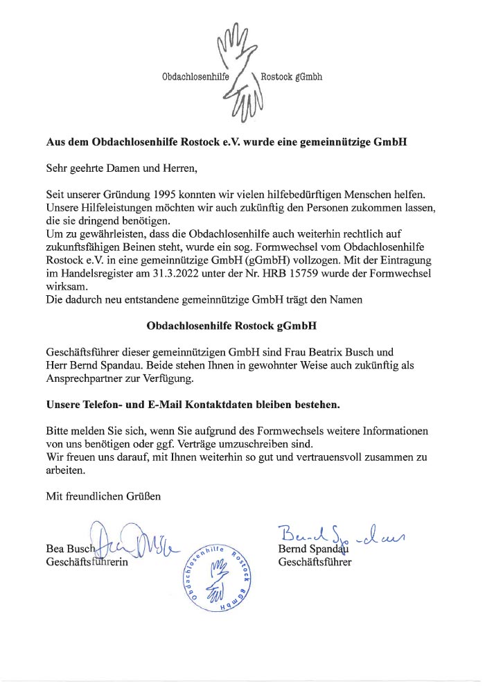 Der Formwechsel in ObdachlosenhilfeRostock gGmbH ist vollzoge.