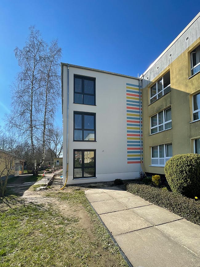 Da uns bewusst ist, dass Erfolge nur durch gute Arbeitsbedingungen erreicht werden können, entstand gemeinsam mit dem Ingenieurbüro für Bauplanung Strübing und Zschuckelt die Idee, ein Bürokomplex mit modernen Arbeitsplätzen an das Obdachlosenhaus anzubauen.
